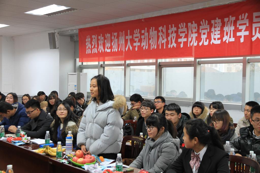 首先,我校动科院、动医院的学生骨干为扬州大学的师生介绍了我校学生工作的特色。分别从思路、规划、举措、创新和党员发展等五个方面阐释了党建班的工作开展情况,此外,就班级团支部的组织建设进行了汇报,内容涉及根植班级、建立制度和服务师生三个方面。