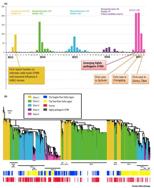 图1:(A)截止到2017年4月,H7N9流感病毒感染人的五波疫情中感染病例数与死亡数统计。(B)用RAxML方法系统展示了H7N9流感病毒HA基因的进化树,以病毒shanghai/1/2013 H7N9为根。高致病性H7N9流感病毒用深紫色表示。使用蓝色,黄色与没有颜色来区分病毒的分离于长三角地区,珠三角地区还是其他地区。红色表示人感染的H7N9病毒分离株,无色表示环境或者禽类的H7N9病毒分离株。